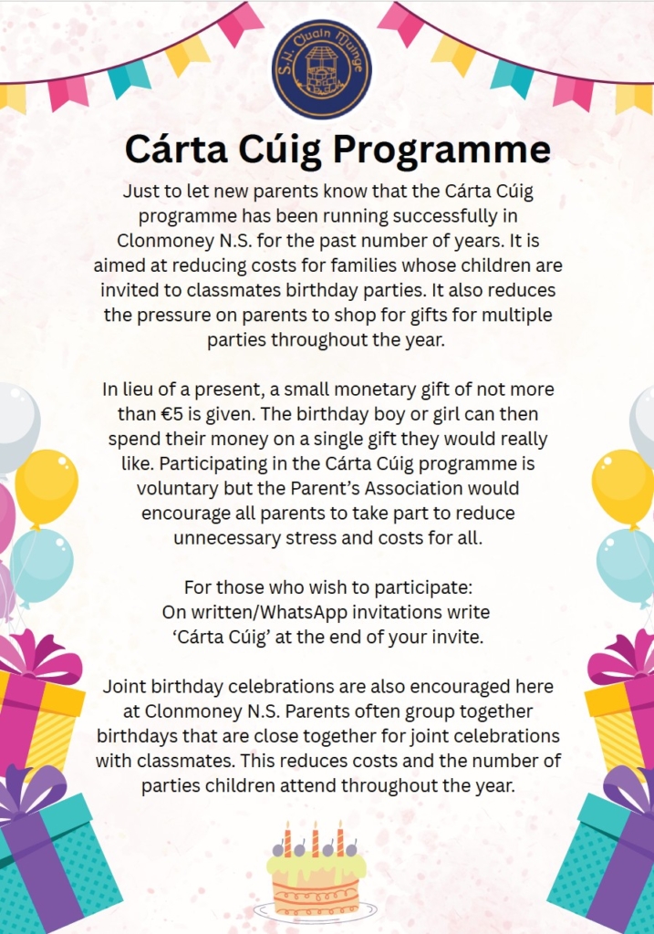 All parents of children attending Clonmoney NS are entitled and encouraged to participate as members of the Parents Association.